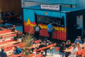 Originally a temporary pop up, Hackney Bridge is here to stay and boasts numerous international food stalls, with a central bar. Both indoor and outdoor seating is provided, so you can enjoy the sunshine on a clear day or shelter from the rain when it’s not. The Outdoor terrace supports views by the river Lea and ensures good COVID safety measures for all customers.